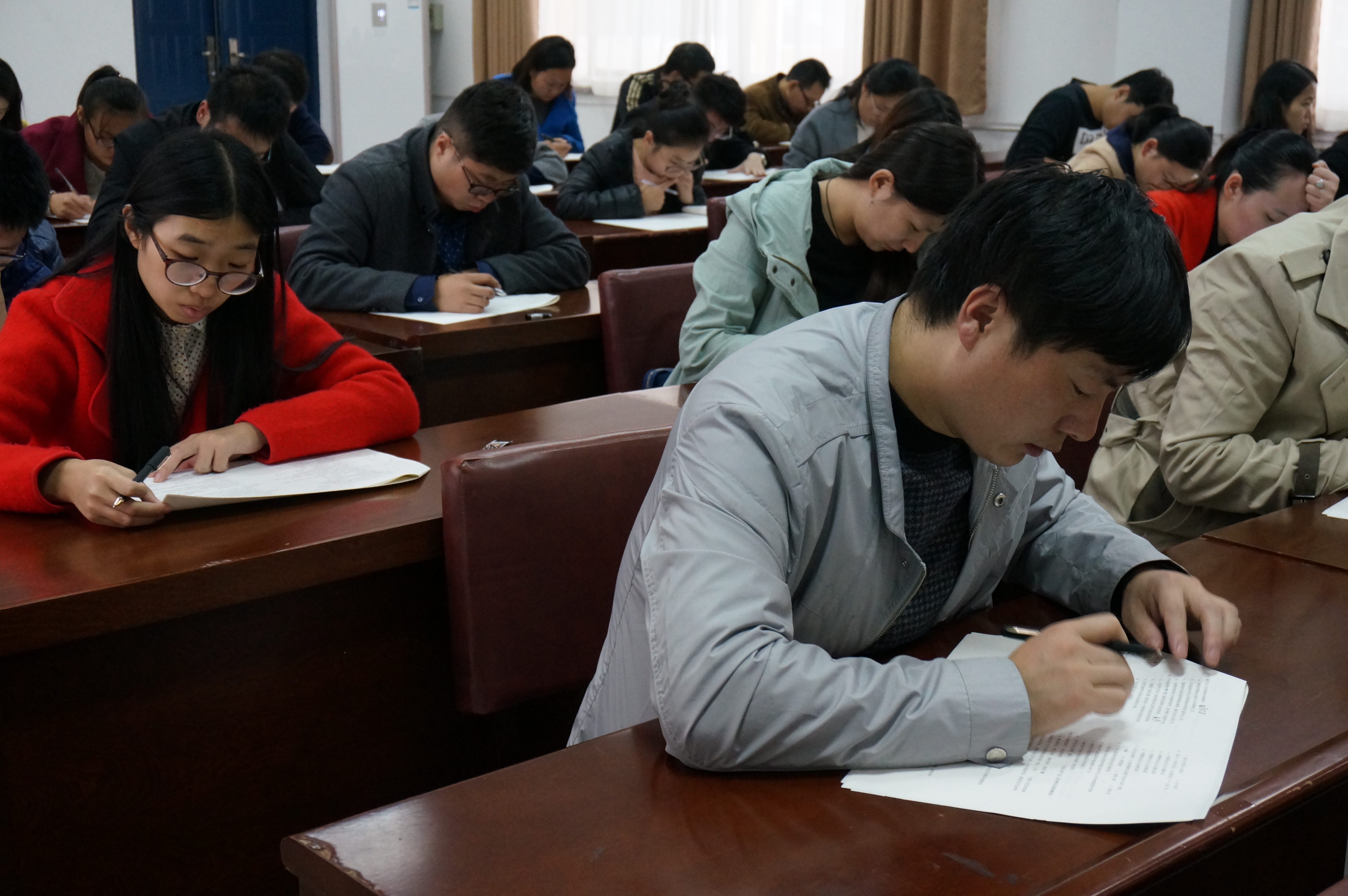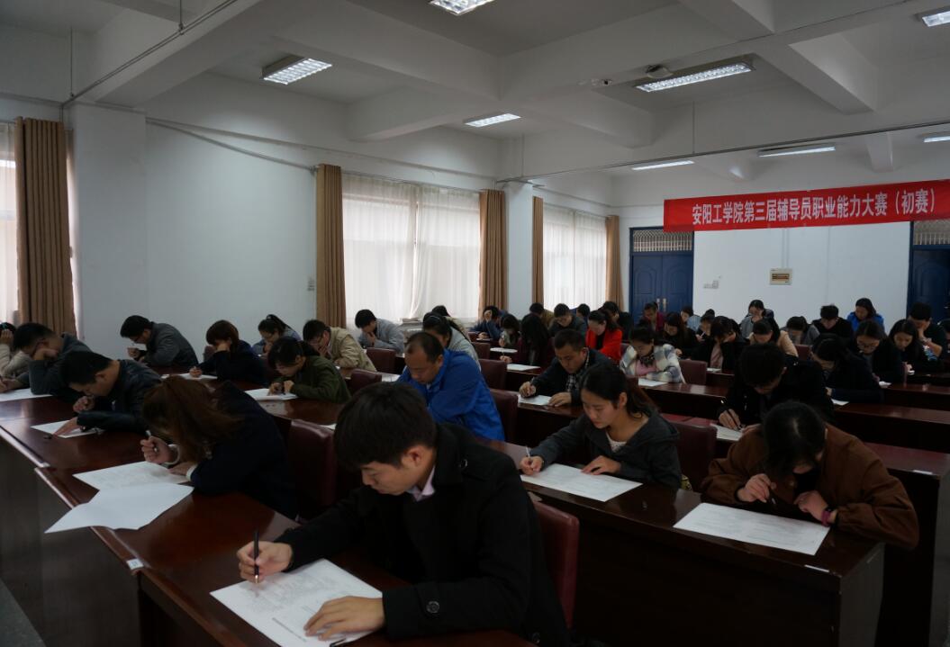 10月26日下午,我校第三届辅导员职业能力大赛笔试在B-02楼316学团会议室进行。本次笔试考查内容涉及《安阳工学院学生手册》、《高校学生工作理论与务实》、《中共中央关于进一步加强和改进大学生思想政治教育的意见》(中发[2004]16号)、《中华人民共和国教育部令》(24号)、《国家中长期教育改革和发展规划纲要(2010-2020年)》、《高等学校辅导员职业能力标准(暂行)》等辅导员工作相关内容,由单选、多选、判断、案例分析、微博写作等五种题型构成。