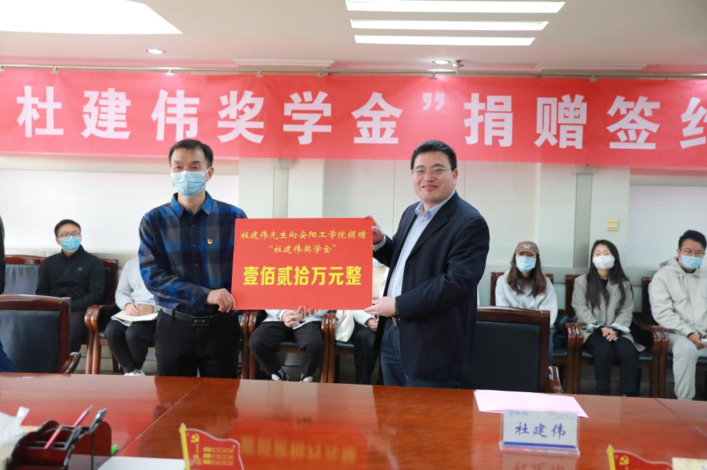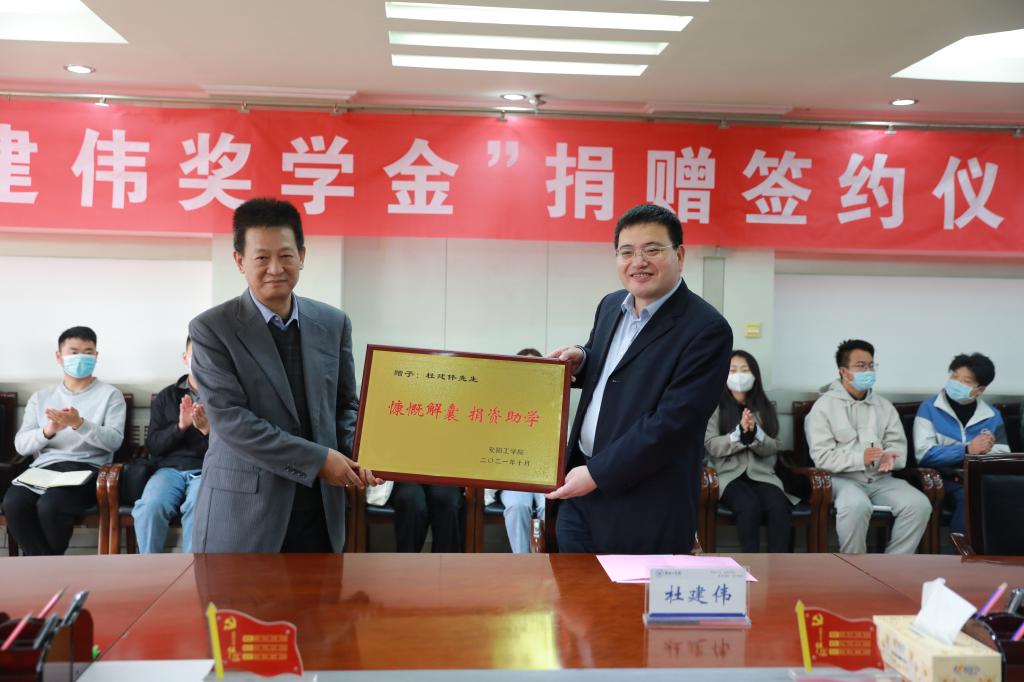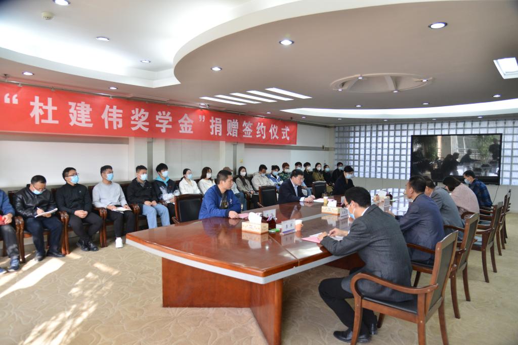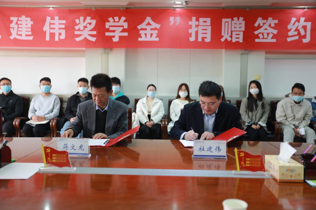 此次杜建伟先生以个人名义自愿捐赠120万元,在我校设立“杜建伟奖学金”,自2021年起,分三年捐赠,每年40万元,捐赠资金全额用于优秀学生奖励。