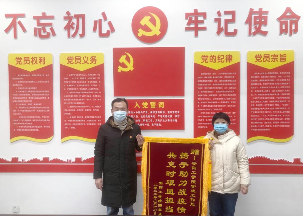 2月23日,汤阴县公路事业发展中心副主任李启伟一行4人代表安阳工学院隔离点为我校学生工作处赠送“携手助力战疫情,共克时艰显担当”锦旗及感谢信,对学生工作处在隔离点疫情防控工作中的大力支持表示衷心的感谢。