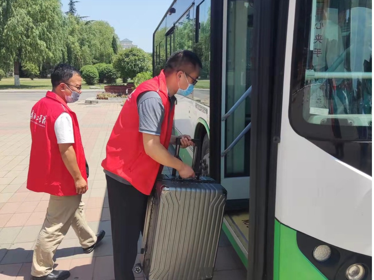 活动现场,支部党员志愿者准时就位,他们与即将离校返家的同学们亲切交流,叮嘱返程回家注意事项,引导大家有序乘车、帮助学生搬运行李,用心用情护送最后一批学生平安离校。