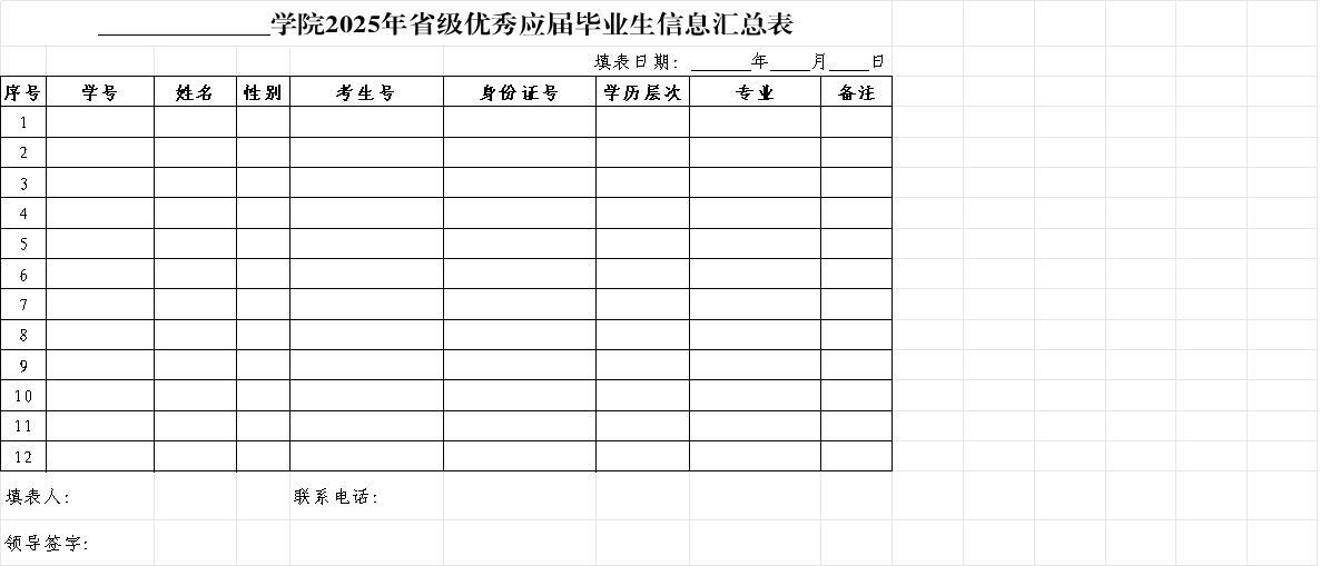 2.各学院、洹滨校区管委会填写《2025年省级优秀毕业生信息汇总表》(见附件3),纸质版一份,领导签字,加盖学院印章。