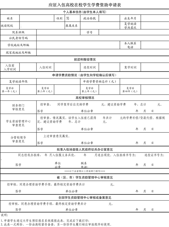 9、将此表格打印两份,随同个人身份证复印件及退役士兵证一并交到校学生资助管理中心。(B02楼211室)