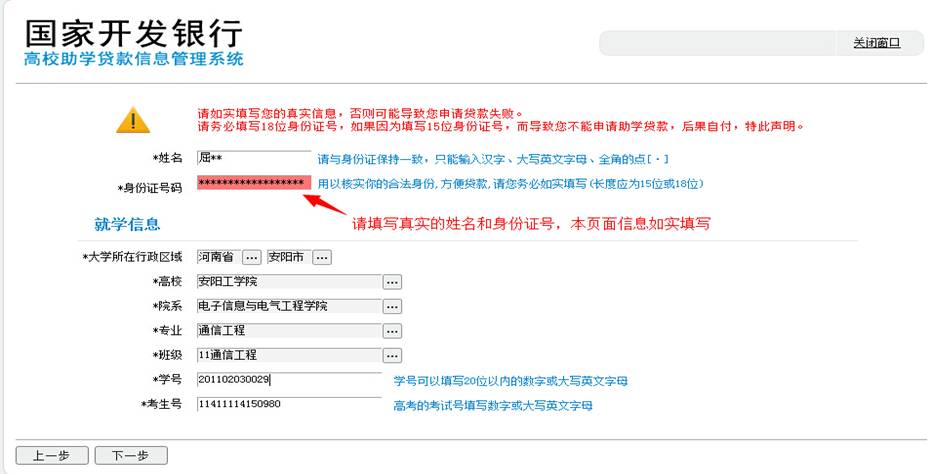 5.进入姓名、身份证号码和就学信息填写页面