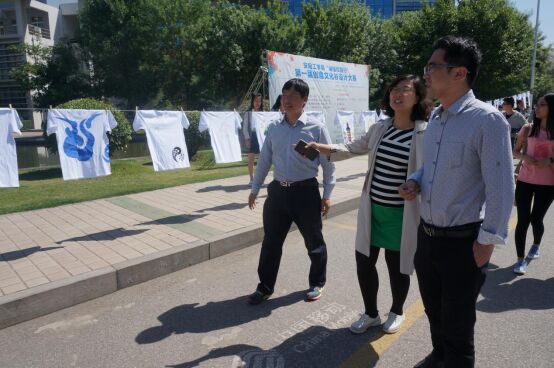 5月16日上午,大赛入围选手的作品在至善湖前展示,校党委宣传统战部部长赵晓晶,校学生工作处副处长刘冰、邓辉,校团委书记王斐、艺术设计学院党总支书记牛晓雷、党总支副书记赵红杰、副院长张春蓉等一行数人前来参观指导。